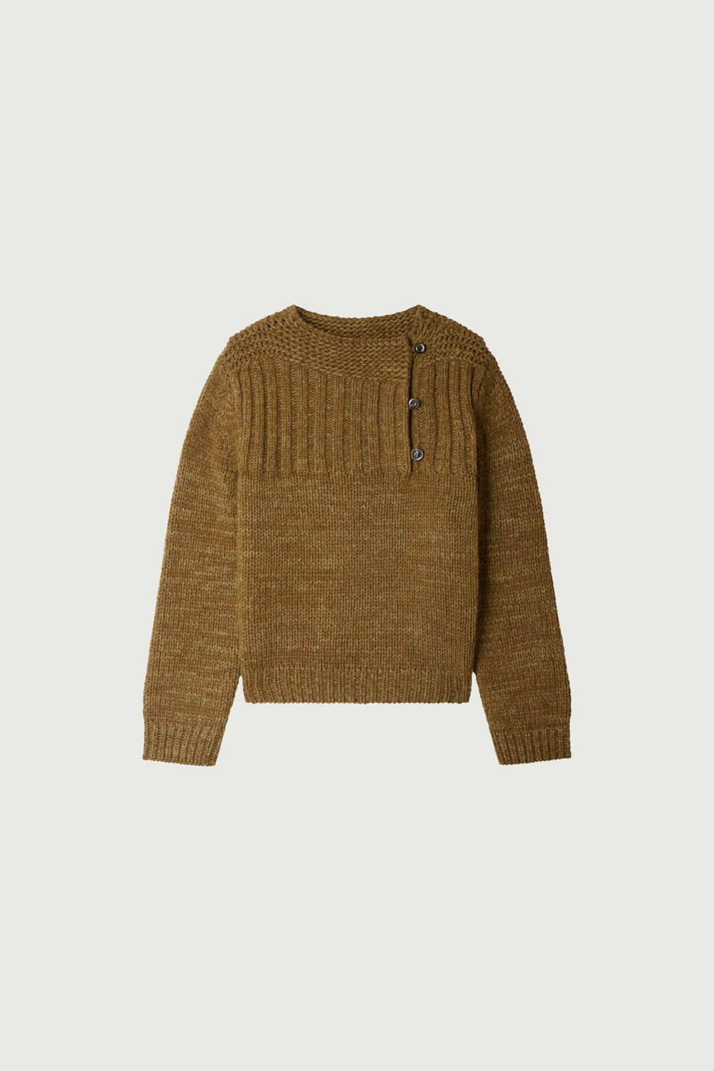 BISCAROSSE is a long-sleeve jumper, knitted from a marled virgin wool yarn. Crafted in a thick yet airy knit, it’s both flexible and comfortable. A buttoned opening at the front allows a side neckline to be revealed. Through a ribbed visual effect, the colour appears marled in shades of khaki and bronze.